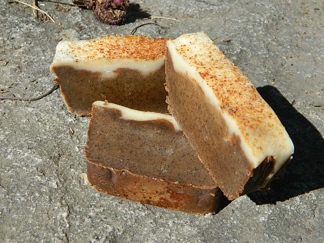 | Cranberry and Pomegranate however was instantly one I loved, but I love cranberries and pomegrantes any way, but my customers generally don't like it, it is a very sweet smell, just like cranberry juice. Rich Dark Chocolate is another standard in my oil stash, I always mix it with peppermint essential oil and cocoa to make choc peppermint, sorry I cant find any photos of that soap. Last time I sorted my oil stash, I thought I would make a jaffa soap with the chocolate fragrant oil and orange essential oil. But my all time favoutite Brambleberry Fragrant oil would have to be Turkish Mocha, it smells just like a hot cup of spiced mocha, the soap is also a favourite of my customers, whether it be: In a cupcake.... Or a Latte..... Or another cupcake |